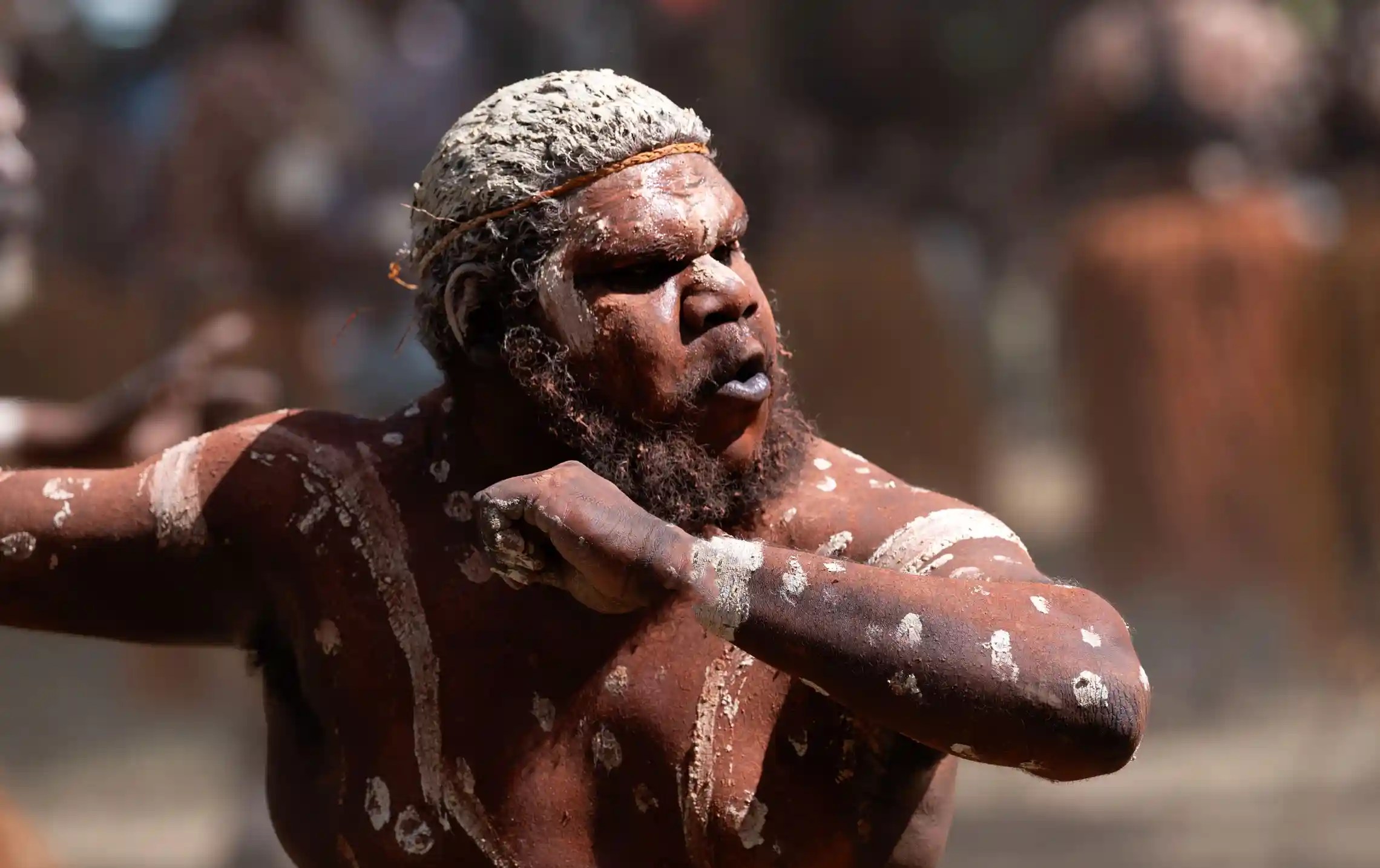 Mala, an Indigenous songman is speaking the music of deep bassy didgeridoo. As his vocal lines of grunts and rhythmic shrieks, backed by cadenced clapsticks, reach a crescendo, he invites the crowd to join him and the Yarrabah Barna dancers in the red dust circle.